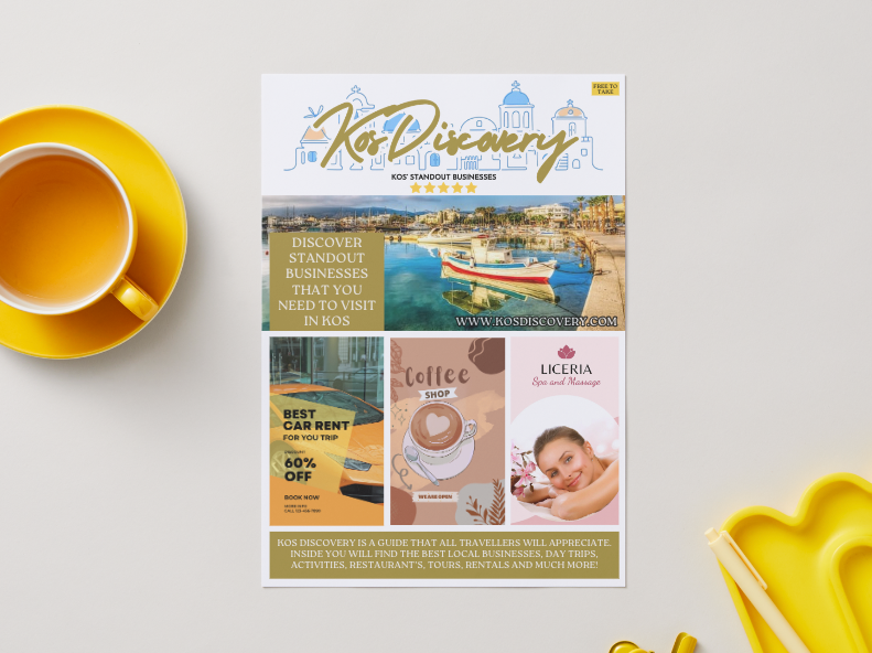 If you would like to advertise your business inside of Kos Discovery, please head to the 'advertise with us' section or click the tab below. If you have no artwork for the magazine, we can help. Just ask!